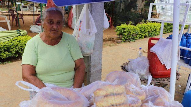 la Villa Serrana por estos días. “Desde que era niña vengo a trabajar acá, vendo bidones para llevar el agua bendita y ahora también chipa, porque ya los peregrinos se acercan de a poco”, contó la doña, mientras acomodaba las crocantes argollas de almidón y los recipientes de plástico que llevan una llamativa imagen de la Virgen.