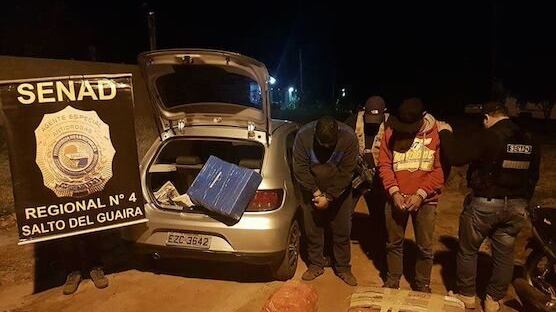 SALTO DEL GUAIRÁ. En un operativo realizado por los agentes de la Senad, lograron detener a dos personas que llevaban un total de 108 kilos de marihuana en la valijera de un automóvil. Cayeron en el barrio Santo Domingo, en el interior de un auto Volkswagen Gol con chapa rapai.