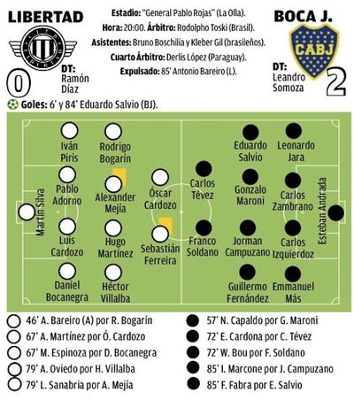 El 0-2 hasta fue generoso para el Guma, que nunca le encontró la manija al partido. Boca hizo lo que quiso y ya a los 6 minutos sucedió lo peor cuando en un desajuste defensivo el “Toto” Salvio se llevó puesto a varios defensores de Libertad para forzar el rebote de Silva y luego fusilar al arquero, tras otro remate previo al palo de un compañero.